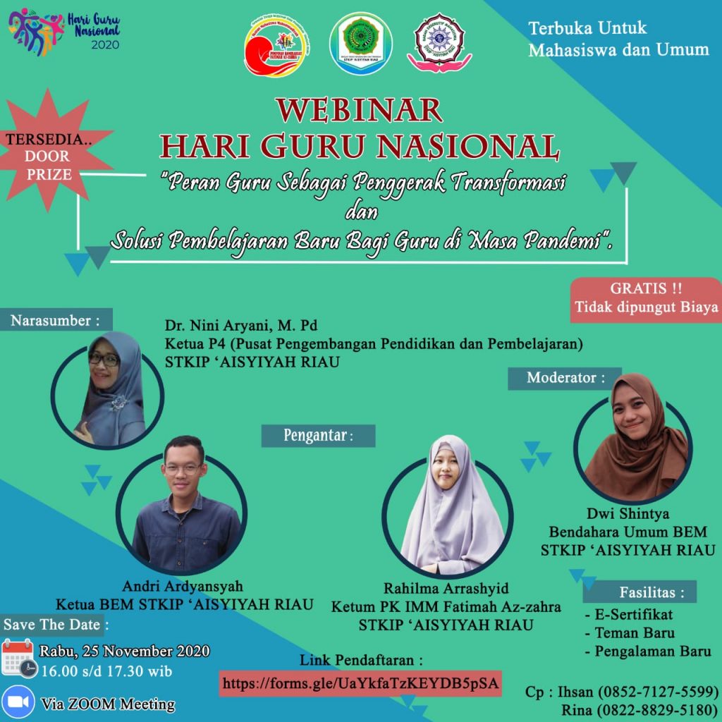 BEM dan PK-IMM Fatimah Az-Zahra STKIP ‘Aisyiyah Riau, mengundang seluruh civitas akademik dan seluruh mahasiswa STKIP ‘Aisyiyah Riau, seluruh guru, warga persyarikatan, serta masyarakat umum dalam acara Webinar Bersempena Hari Guru Nasional Tahun 2020 via Zoom Meeting.