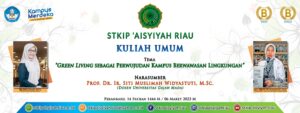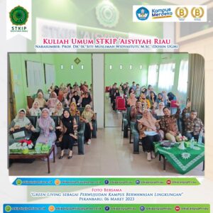 STKIP ‘Aisyiyah Riau. Sabtu, 14 Sya’ban 1444 H bertepatan dengan 06 Maret 2023 M, STKIP ‘Aisyiyah Riau menyelenggarakan kuliah umum dengan tema “Green Living sebagai Perwujudan Kampus Berwawasan Lingkungan”. Pada kesempatan kuliah umum kali ini, STKIP ‘Aisyiyah Riau menghadirkan Ketua Majelis Pendidikan Tinggi Pimpinan Pusat ‘Aisyiyah yaitu Prof. Dr. Ir. Siti Muslimah Widyastuti, M.Sc., yang juga merupakan dosen Universitas Gajah Mada. Kegiatan akademik kuliah umum ini di ikuti seluruh civitas akademika STKIP ‘Aisyiyah Riau di Aula serbaguna STKIP ‘Aisyiyah Riau.