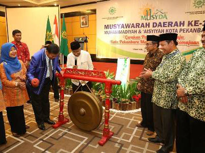 Wali kota Pekanbaru memukul gong tanda dimulainya Musda Muahmmadiyah Pekanbaru.